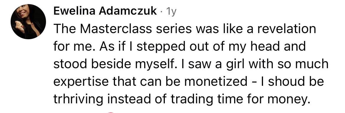 In this masterclass, I’ll show you how to break free from the time-for-money trap — from selling to single clients or running offline programs — to selling endlessly scalable online courses. You’ll make more money, with less work, and serve your clients even better.