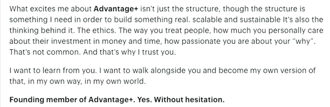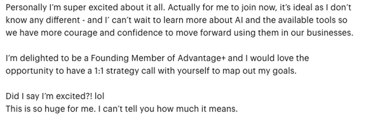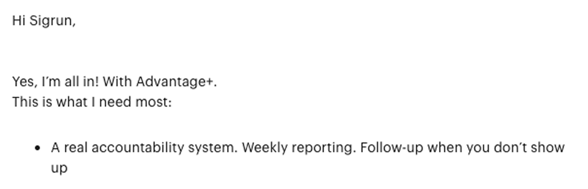 Advantage+ gives you all of that plus monthly strategy calls with Sigrun, ads coaching and a private channel.