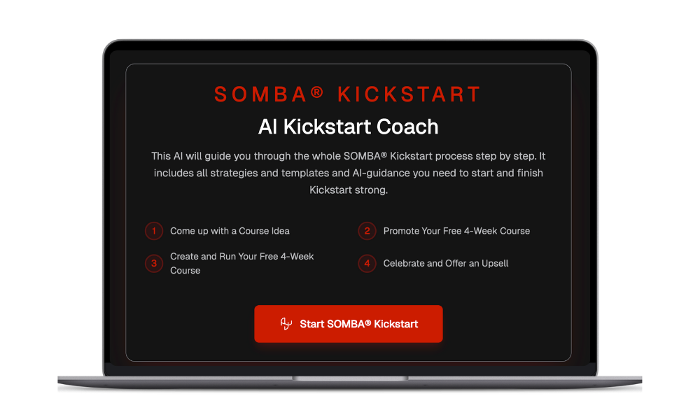SOMBA® Kickstart helps you create a sellable online course, so you can help more people – while working less hours and earning more money.